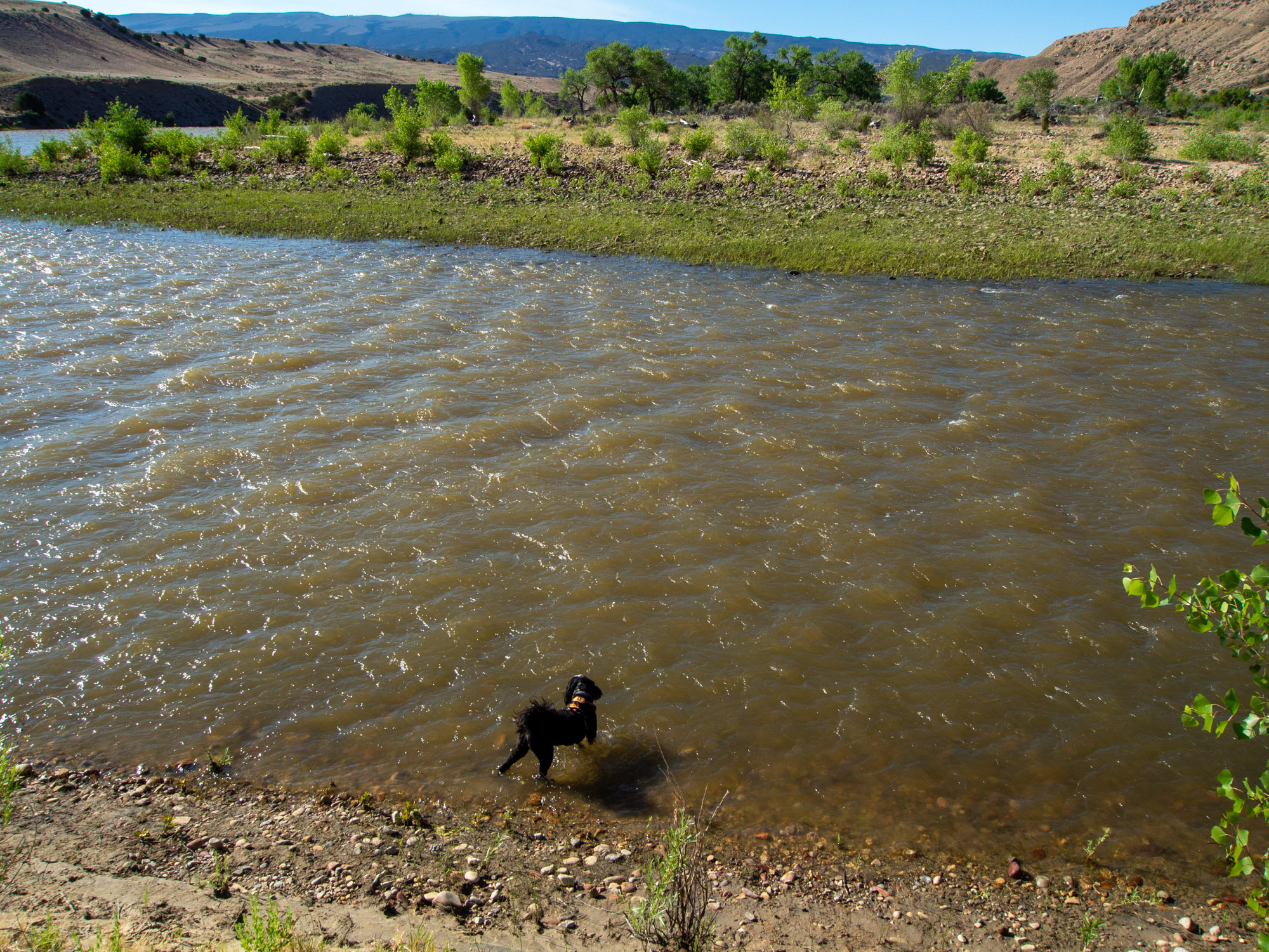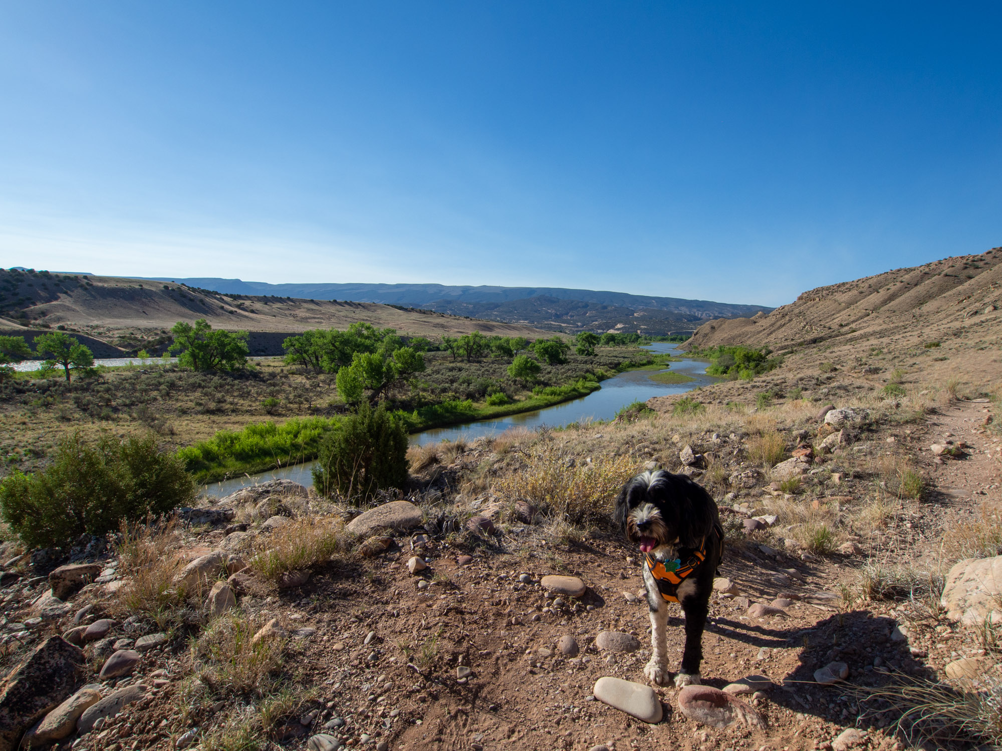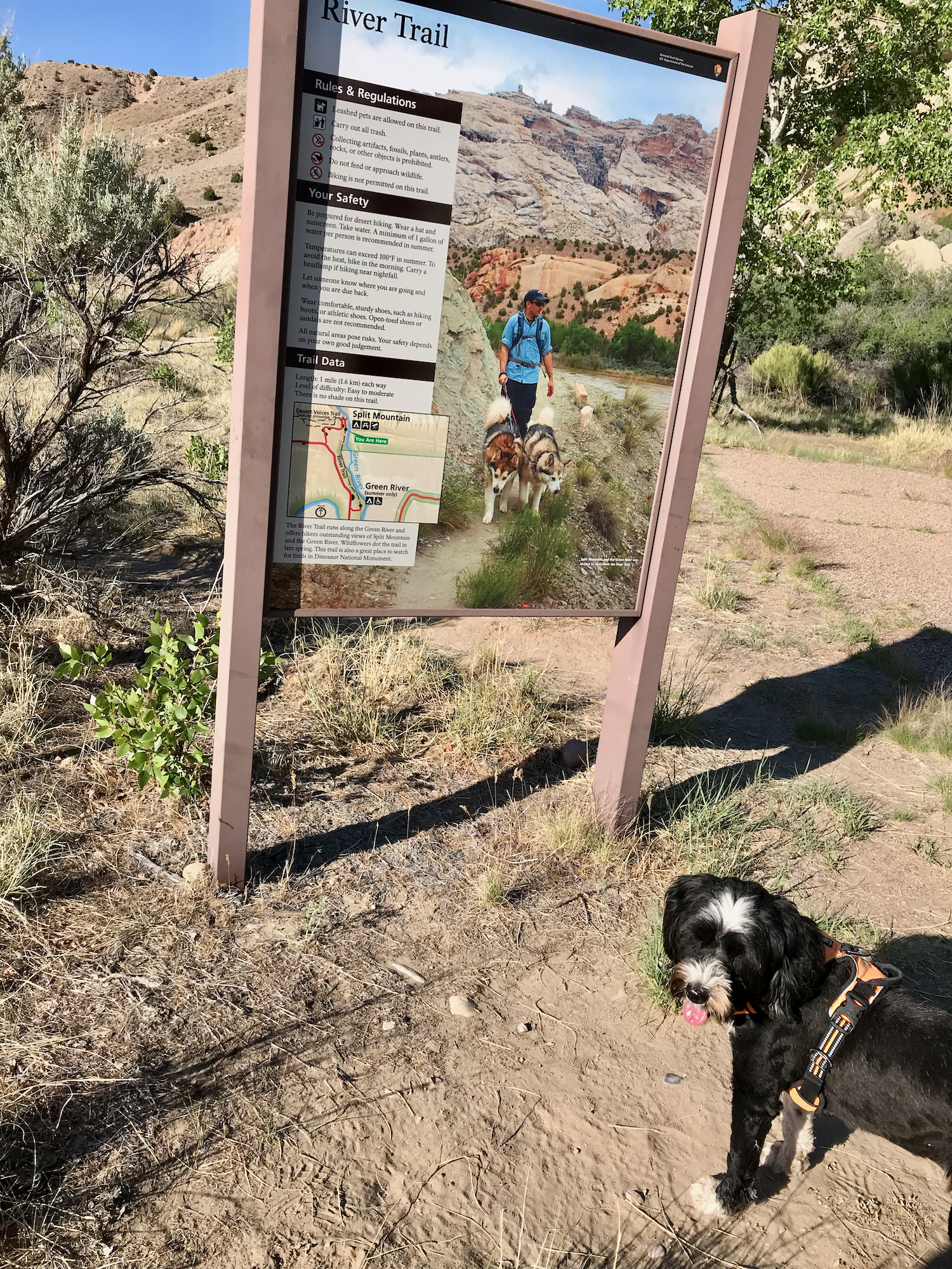 Based on our earlier experiences I knew I needed to take Jake out early if we were going to do any hiking. The only trail open to dogs goes along the Green River between two campsites. It was a really nice trail – we went about halfway from the Split Mountain campground before turning back. The campground was full of cars and trucks pulling trailers for rafting.