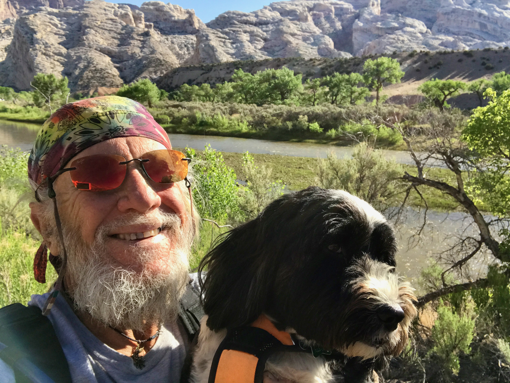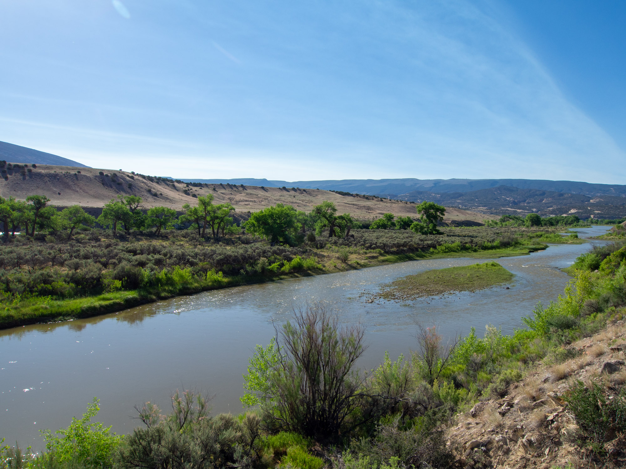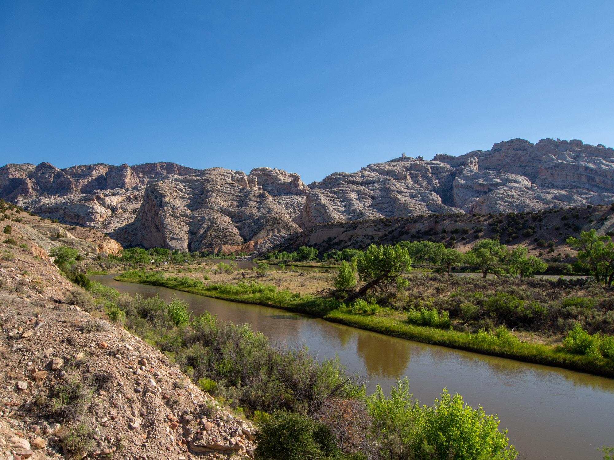 Based on our earlier experiences I knew I needed to take Jake out early if we were going to do any hiking. The only trail open to dogs goes along the Green River between two campsites. It was a really nice trail – we went about halfway from the Split Mountain campground before turning back. The campground was full of cars and trucks pulling trailers for rafting.