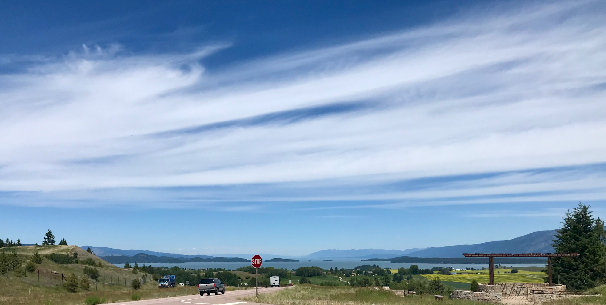 We left Columbia Falls and drove down on the east side of Flathead Lake and then started heading east. For both days I was taken by the beauty and diversity of the landscape. I we drove it became more prairie-like with vast green undulating hills with dramatic mountain ranges in the background.