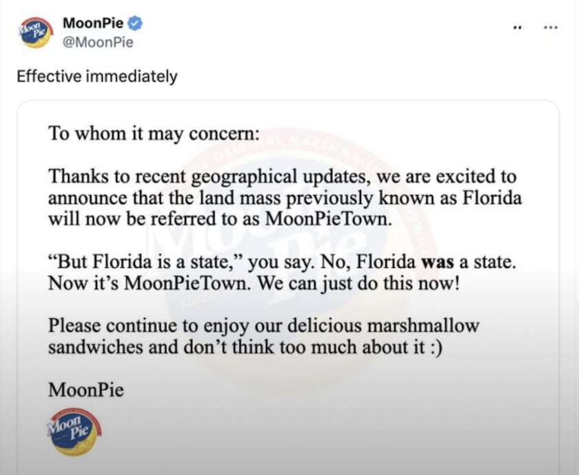 For no apparent reason, it was announced that the once-known Free State of Florida has been renamed MoonPieTown.