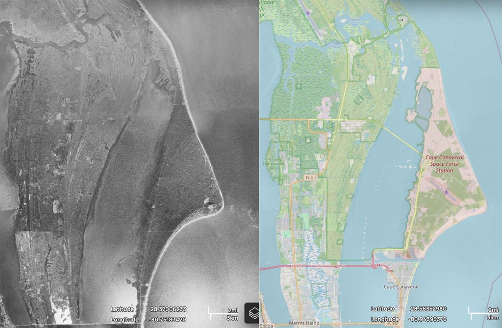 The Banana River Empire: Banana is arguably one of the most significant cities globally, as evidenced by the Cape Canaveral Space Force Command on the left and Patrick Space Force Base on the right.