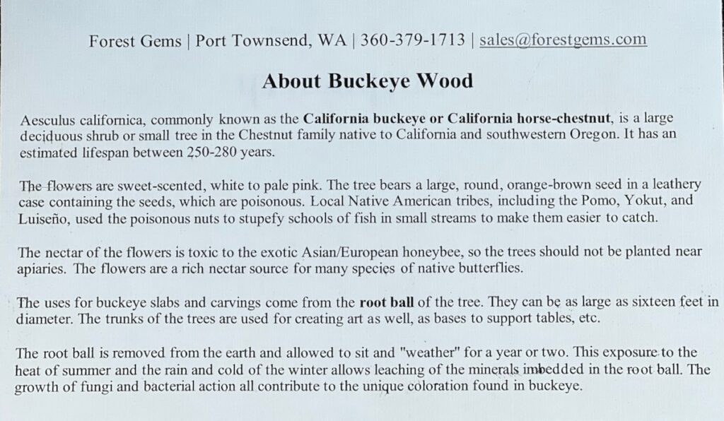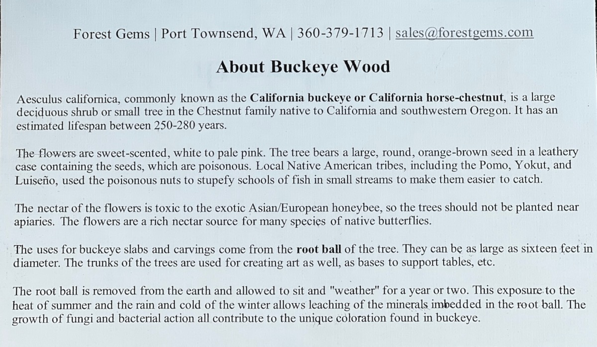 Buckeye wood (burl) from North California with Manzanita base carved by Bruce Stamp sold by Forest Gems Pt. Toownsend, WA Summer 2023