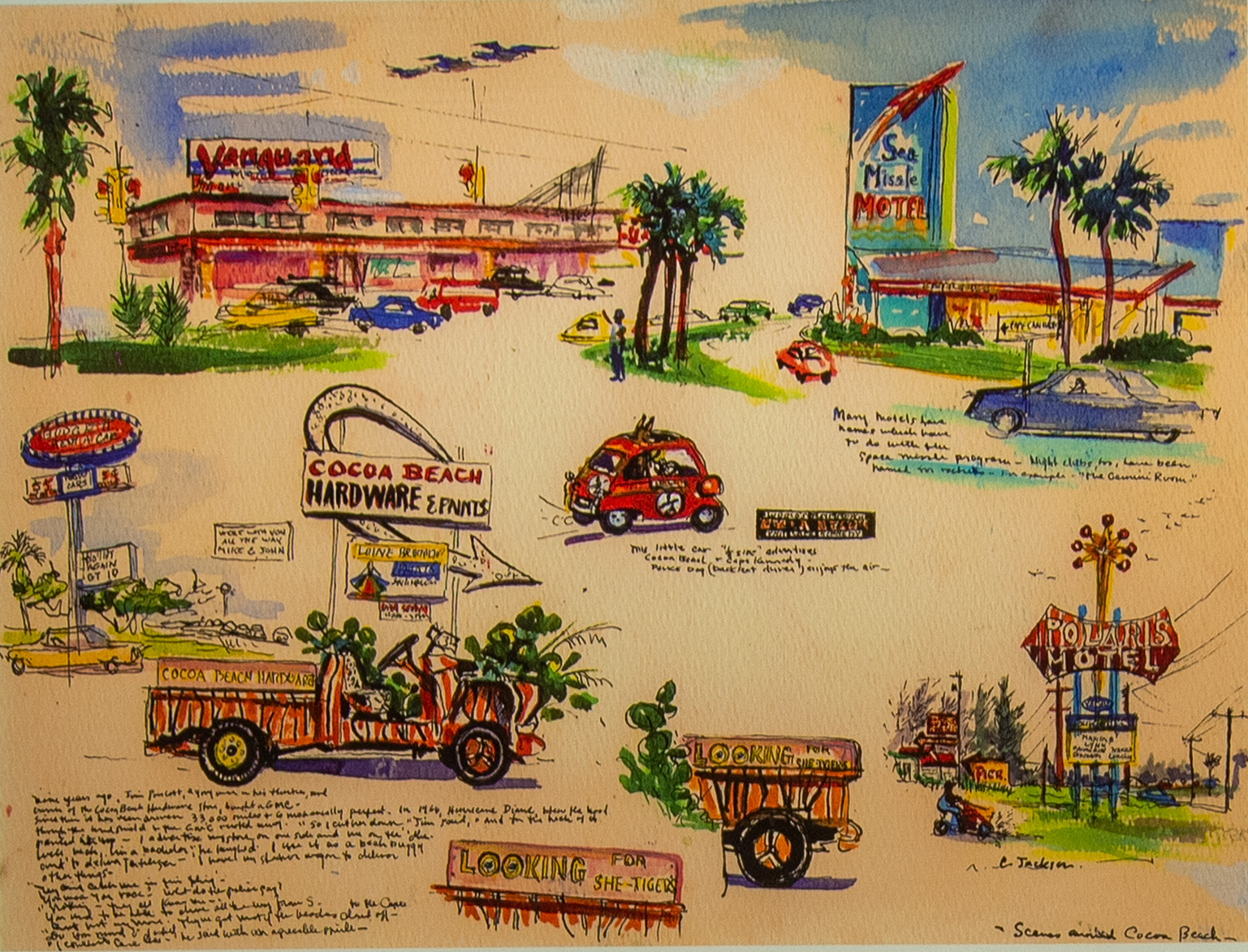 Painting by Chrystal Jackson of Cocoa Beach in the 1960s. She was one of several artists commissioned to capture the unique time in our history.