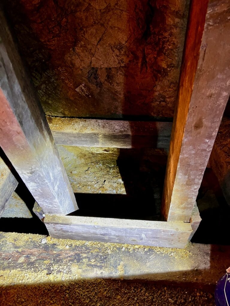 Then we were passed off to Richard to take us 400 ft back into the mine. It was damp (again that heavy winter rain) and I banged my head a couple of times. At the end was some equipment set up and the caved-in entrance to a shaft for one of the ten tunnels below this one!
