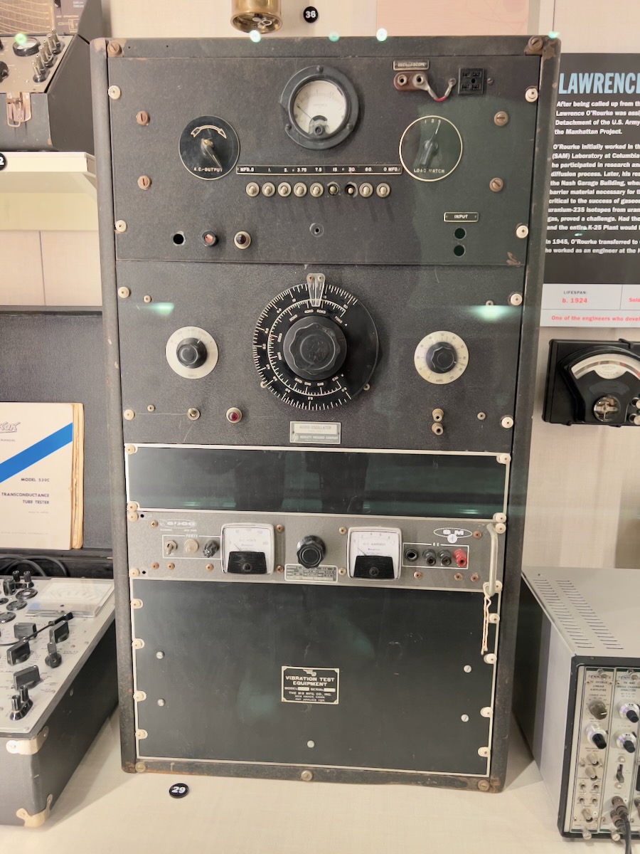 This is a machine to test vibration (my first job) using a Hewlett-Packard Oscilloscope – HP’s first product made in the early 1940s. I worked on it’s successors many, many years later during my time at HP in the 1980s.